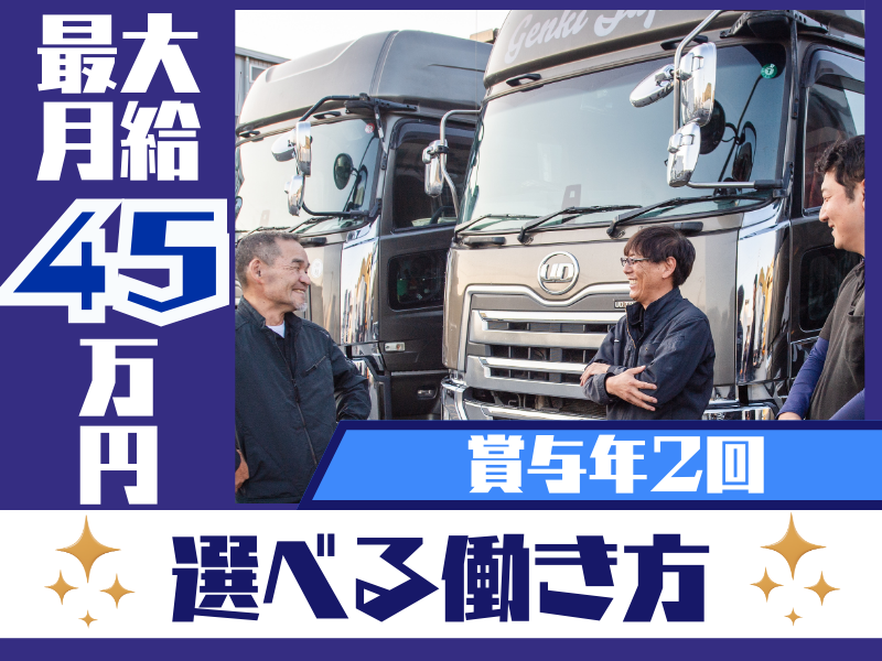 株式会社元気ジャパン★どの仕事にするかは面接時に相談★最大月給45万円!賞与年2回!週休2日制でしっかり休めるトラック...