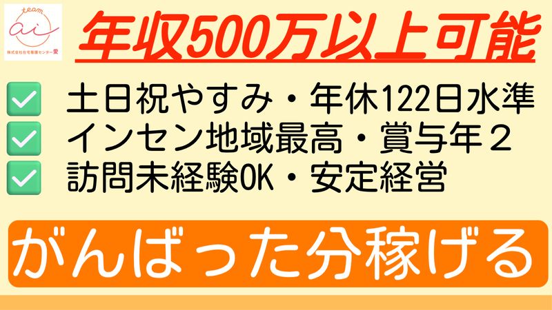 株式会社在宅看護センター愛【年休122日水準】【土日祝休み】【手当豊富】【年収500万可能】【グループ幹部目指せる】【賞与年...