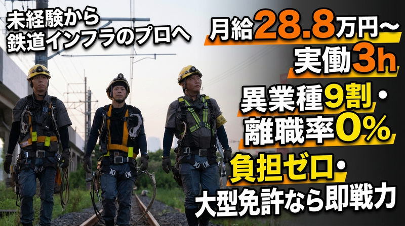 【寮完備】未経験から鉄道網という生命線を支える工事スタッフ/お昼と夜間のみで実質3時間作業