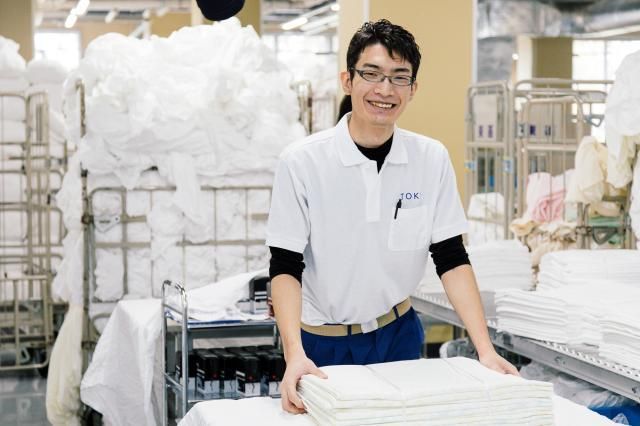 クリーニング工場内での仕分け・梱包スタッフ