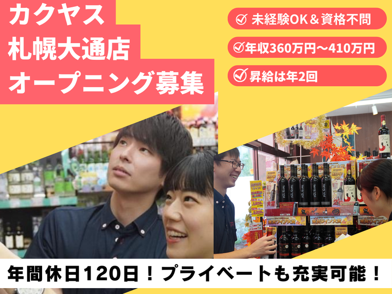 【オープニング募集】カクヤス札幌大通店 店舗運営&販売スタッフ/年間休日120日/月給30万円以上/販売未経験も歓迎!