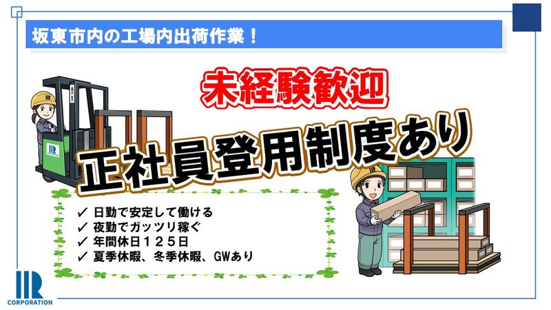 株式会社アイアール【坂東市】未経験OK!ライン作業なし◎選べる日勤・夜勤の工場内作業
