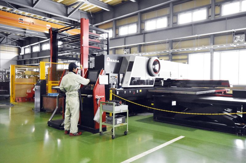 工場内での鋼材の切断・加工作業