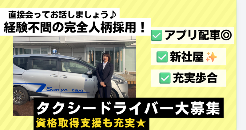 株式会社三洋タクシー2種免許は会社負担★アプリ配車の稼ぐ仕組み◎売上歩合約5割!