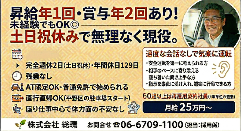 求める人材: ⏩必須要件⏩ ・普通運転免許(AT限定可) ⏩未経験...