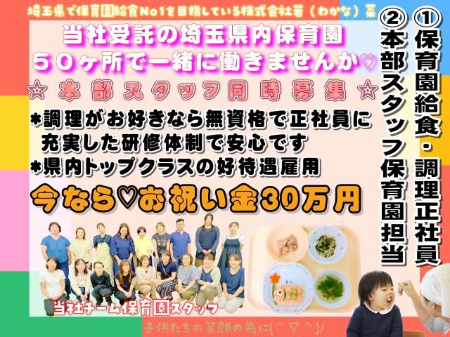 株式会社若菜【調理師・栄養士】10/1オープン!入社祝い金30万円支給!資格・経験を活かせます!ルアナ保育園土呂