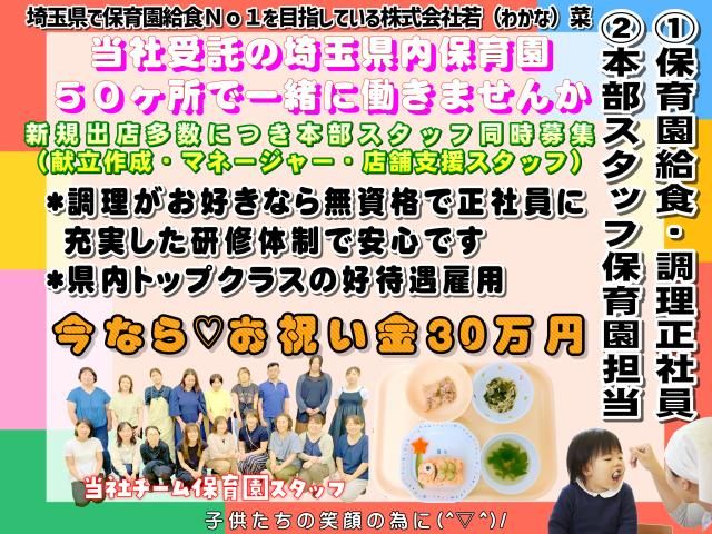 株式会社若菜【調理師・栄養士】2月オープン!オープニング募集!入社祝金30万円支給!南浦和たいよう保育園