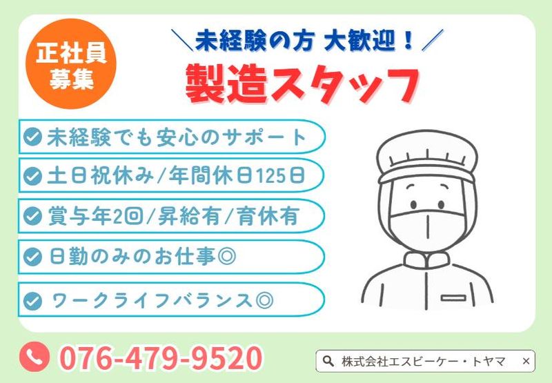 株式会社エスビーケー・トヤマ未経験OK!日勤のみ◎年休125日×土日祝休み◎賞与年2回♪