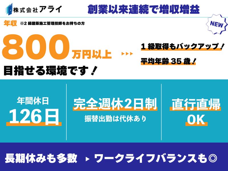 株式会社アライ1級資格取得をバックアップ!平均年齢35歳・年間126日休み