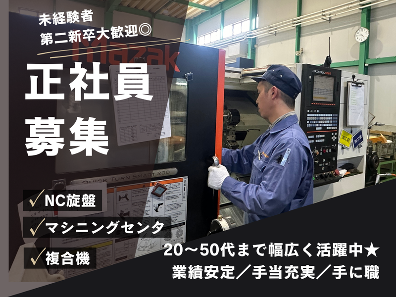 【マシンオペレーター】産業機械に使用される部品の金属加工職、マシニングセンター、NC旋盤。セッティング、監視、仕上げ作業に加え、経験に応じてマシンプログラム・段取り・メンテナンス、試作品製作などをお任せします。