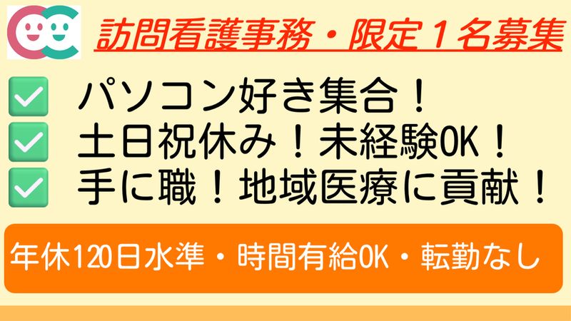 応募資格 ・事務経験 ・パソコンが得意な方 ※訪問看護事務経験不問 ...